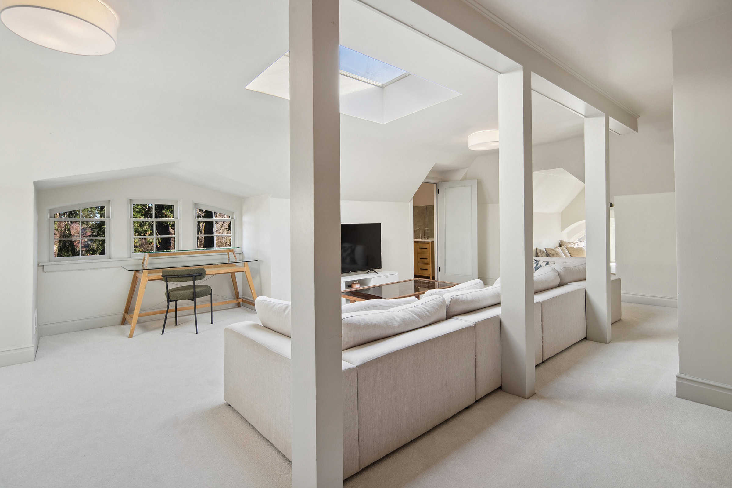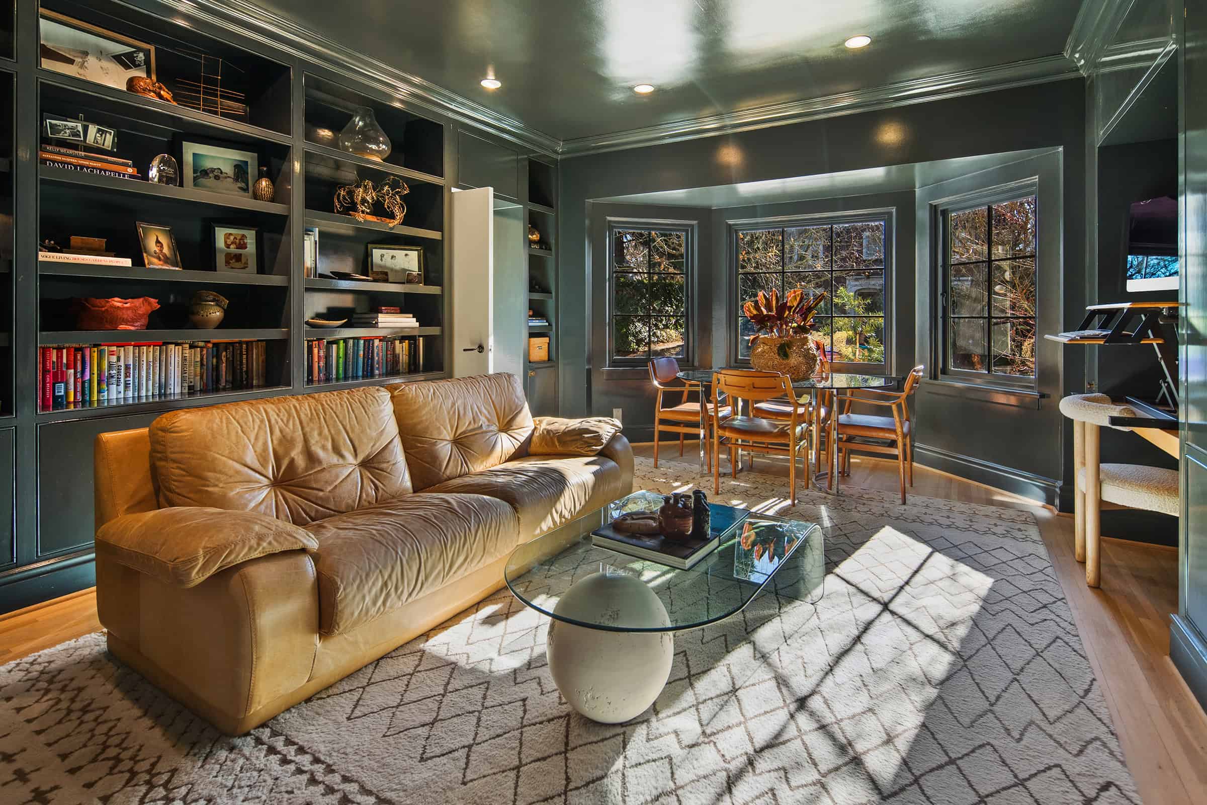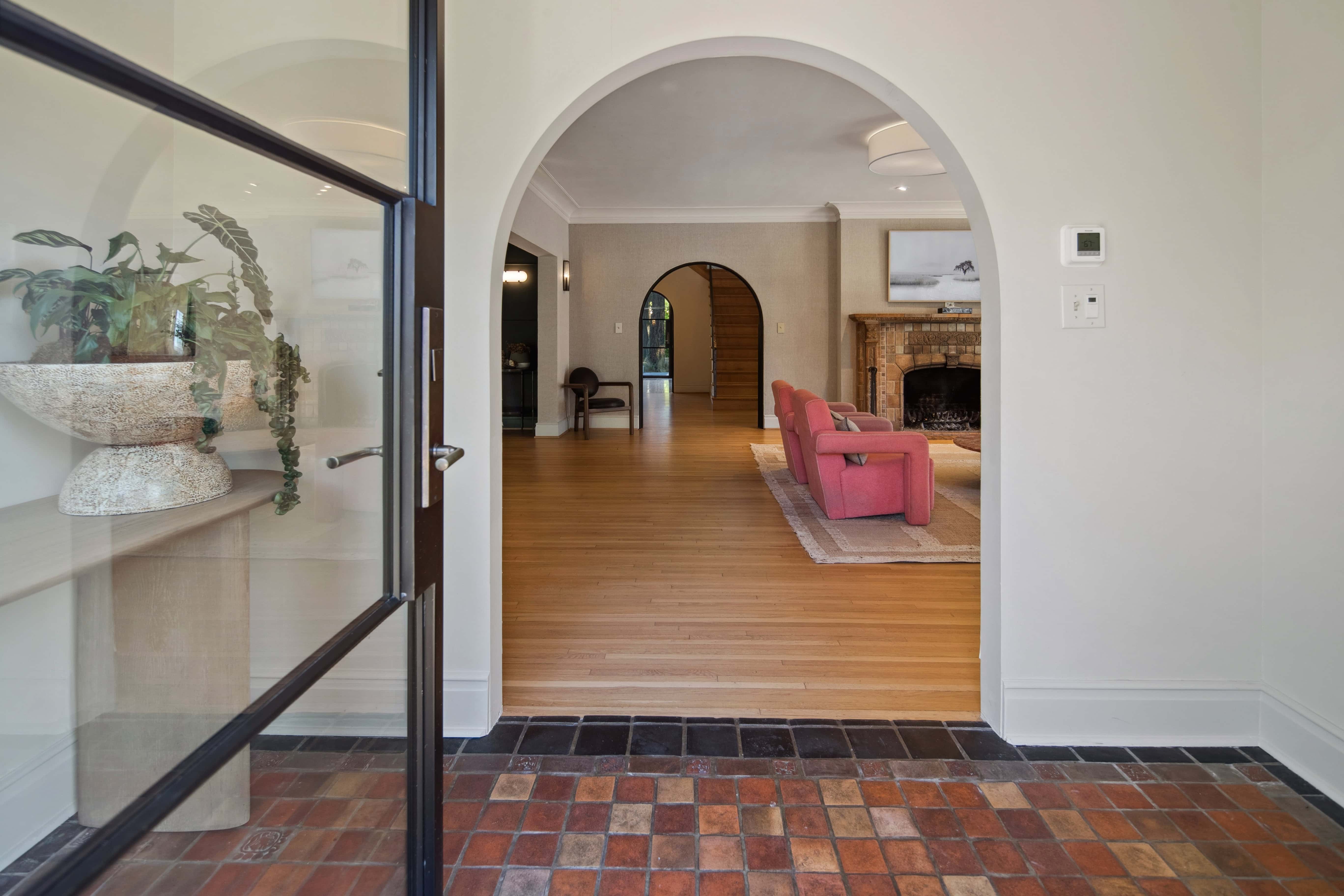 Inside, an antique fireplace and beautiful hardwood floors anchor a bright, open-concept living and dining space. In the kitchen, Wolf, Miele, and Sub-Zero appliances complement elegant marble countertops and a spacious island with dual sinks, while an adjoining butler's pantry allows for seamless entertaining. French doors open to the patio, blending indoor and outdoor living. An adjacent study with custom built-ins offers a refined workspace.